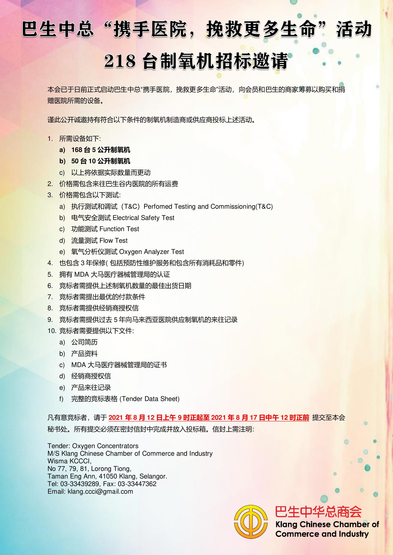 巴生中总“携手医院,挽救更多生命”活动218台制氧机招标邀请