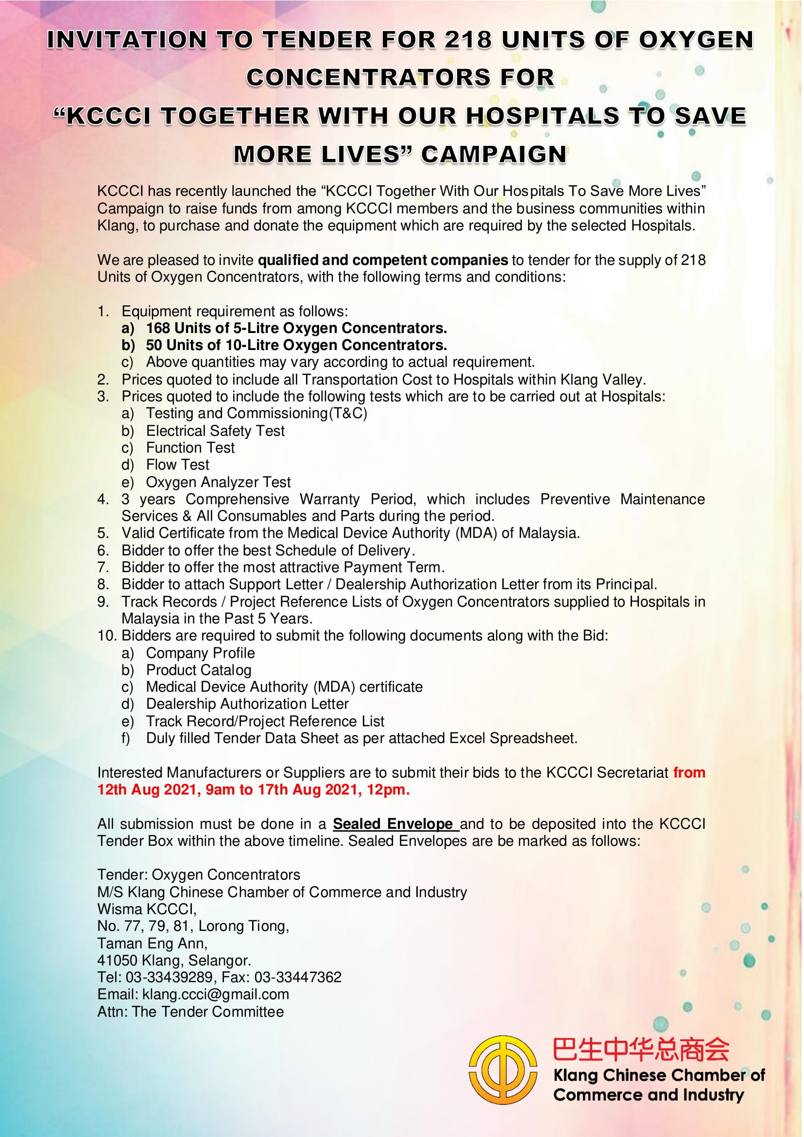 Invitation To Tender For 218 Units Of Oxygen Concentrators For “KCCCI Together With Our Hospitals To Save More Lives” Campaign