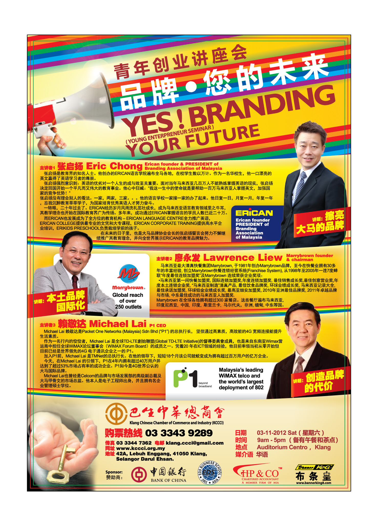 吉隆坡暨雪兰莪中华总商会与巴生中华总商会订于2012年9月20日(星期四)于吉隆坡暨雪兰莪中华总商会研讨室联合承办一项为时半天之“台湾侨务委员会经贸巡回讲座”。We are pleased to inform that the Chinese Chamber of Commerce and Industry of Kuala Lumpur and Selangor (KLSCCCI) and Klang Chinese Chamber of Commerce and Industry (KCCCI) are jointly presenting the above seminar on 20th September 2012 (Thursday).