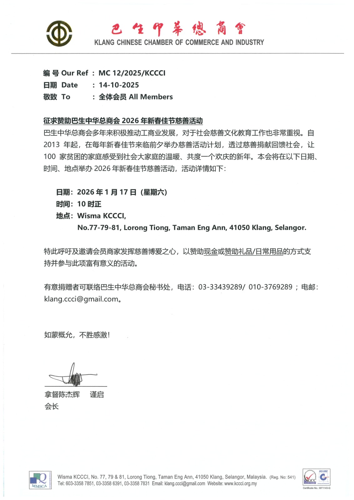 巴生中华总商会多年来积极推动工商业发展,对于社会慈善文化教育工作也非常重视。自2013年起,在每年新春佳节来临前夕举办慈善活动计划,透过慈善捐献回馈社会,让100家贫困的家庭感受到社会大家庭的温暖、共度一个欢庆的新年。本会将在以下日期、时间、地点举办2026年新春佳节慈善活动,活动详情如下: