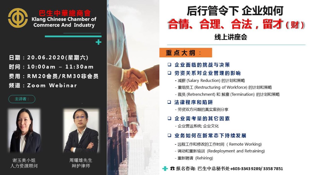 目的: 为企业、商家们分析及讲解在行管令期间所面临的劳工合约问题,让企业老板们能够有效地处理人事开支整合,以合情、合理及合法化的方式维持雇主与员工之间的和谐关系。