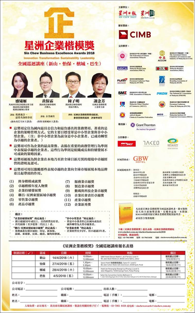 《星洲企业楷模奖》全国巡回讲座,以华语主讲,入场免费, 欢迎您與朋友們报名参与!