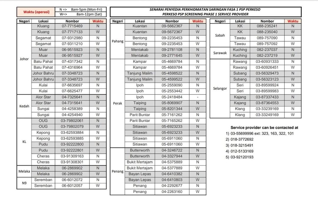 [Perkeso PSP] Screening Phase 1 Service Provider List According To State