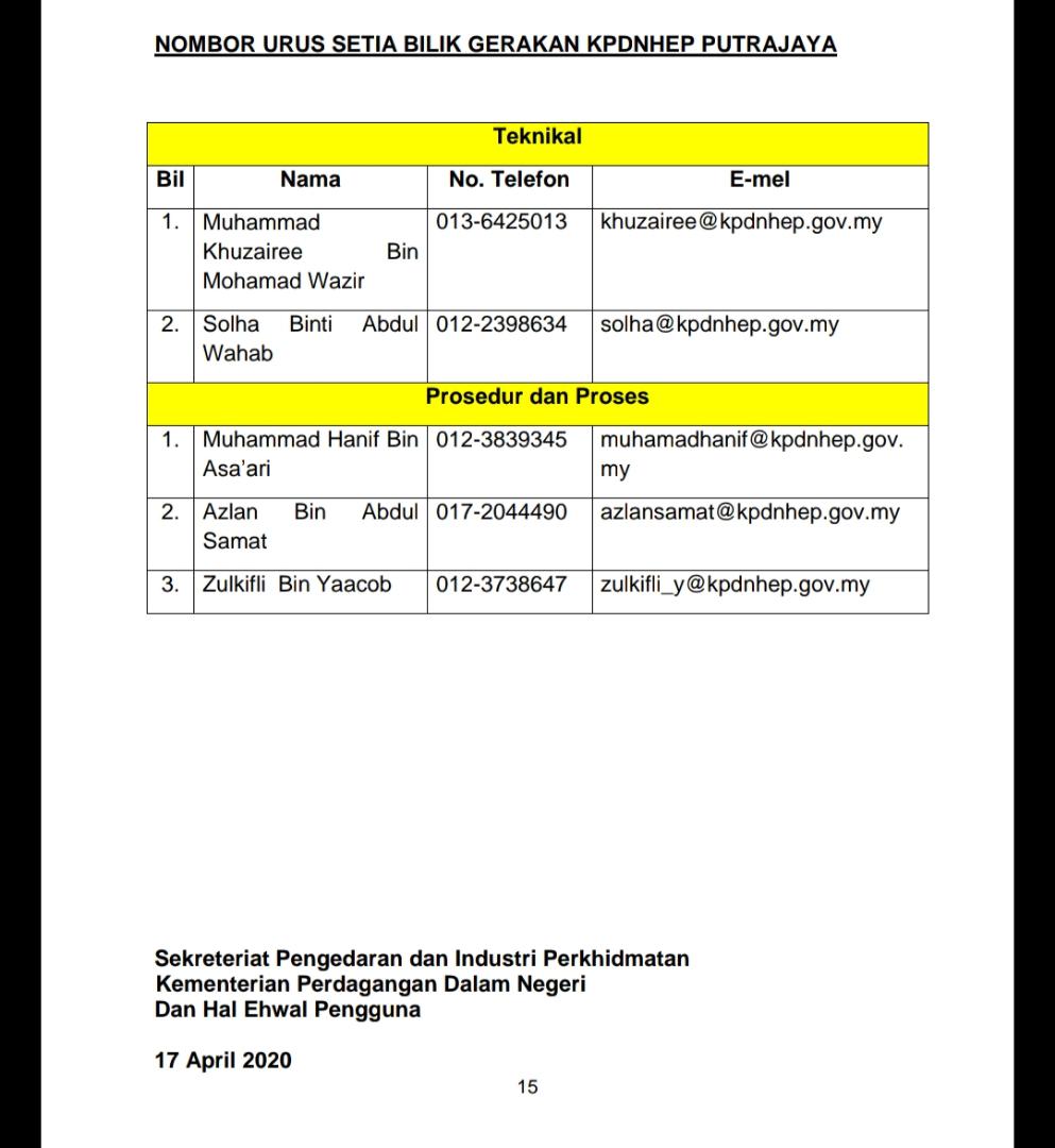 For those businesses fall under the supervision of KPDNHEP, you may contact the numbers (file attached) for any inquiry for the application & operation issue during MCO. Thank you!