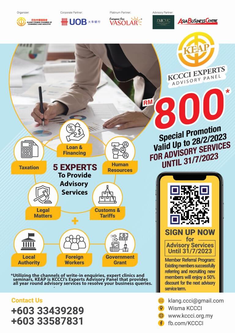 Klang Chinese Chamber of Commerce and Industry (KCCCI) has set up the KCCCI Experts Advisory Panel (KEAP) to serve you all year round in solving your business problems and help your business upgrade, optimize and transform.