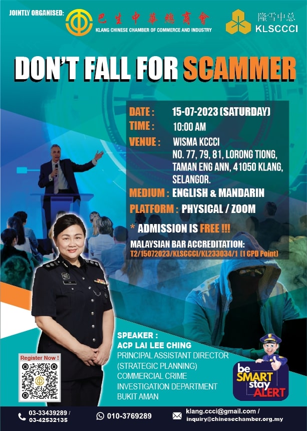 Klang Chinese Chamber of Commerce & Industry (KCCCI) and The Chinese Chamber of Commerce & Industry of Kuala Lumpur and Selangor (KLSCCCI) will jointly organise a Talk on “Don’t Fall for Scammer”. Details are as follows: