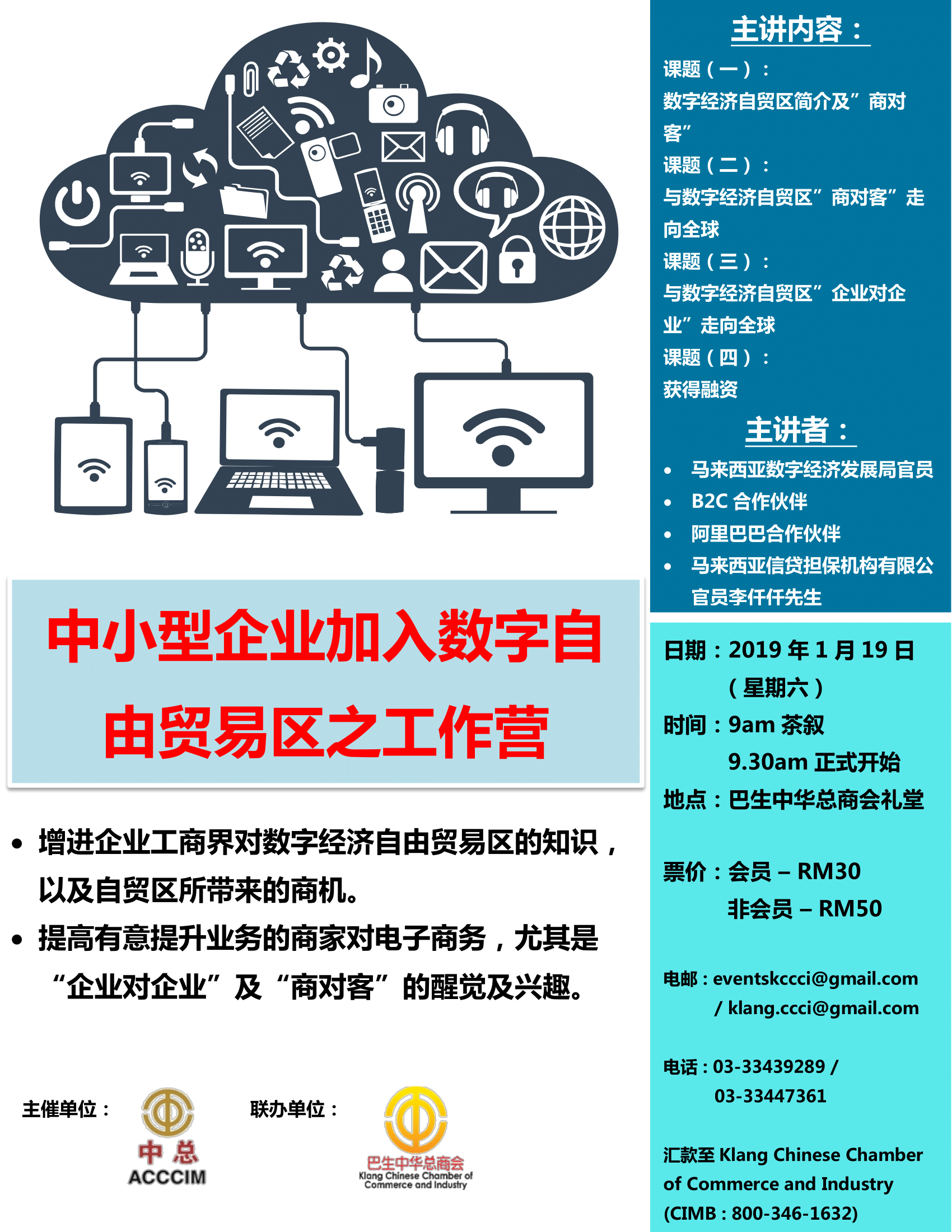 马来西亚中华总商会(中总)为主催单位,巴生中华总商会与马来西亚数字经济发展局(MDEC)为协办单位将举办 中小型企业加入数字自由贸易区之工作营 。