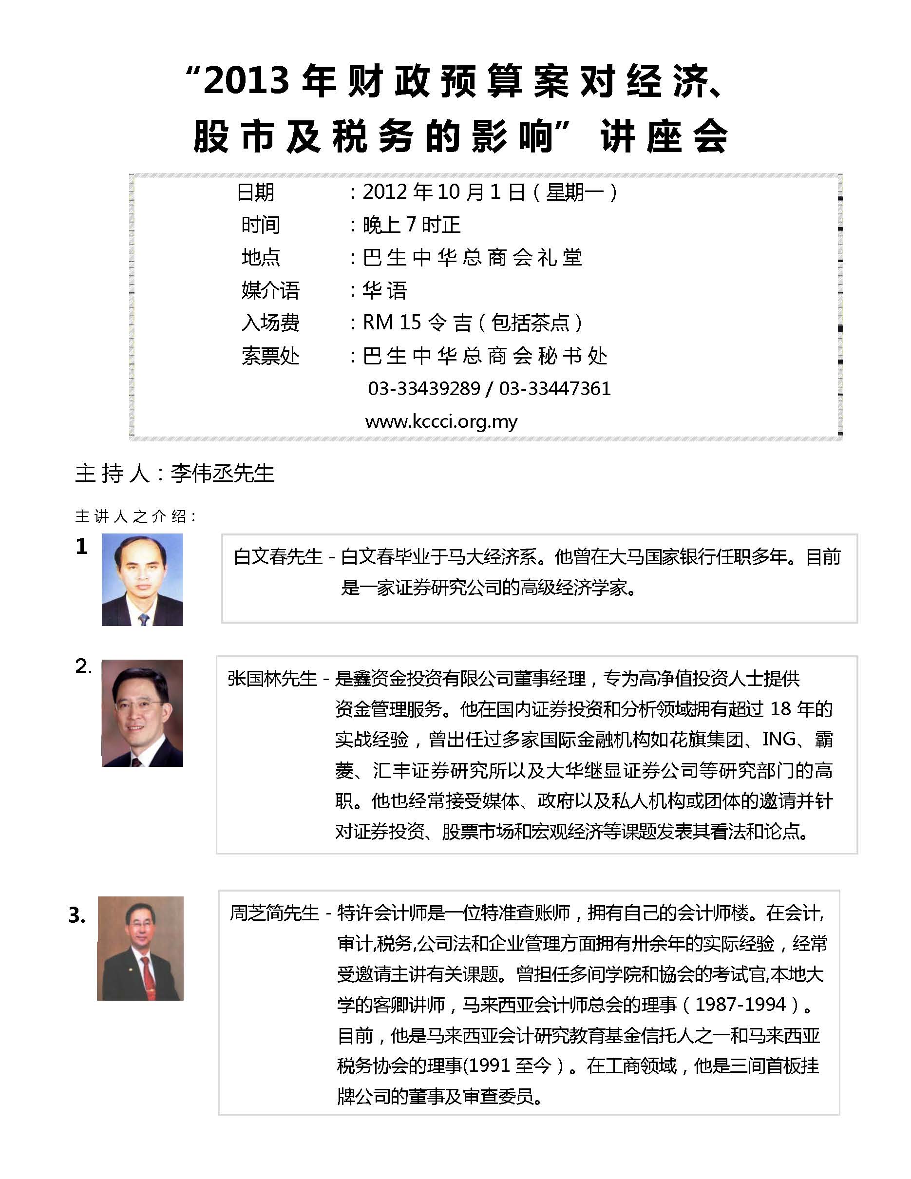 吉隆坡暨雪兰莪中华总商会与巴生中华总商会订于2012年9月20日(星期四)于吉隆坡暨雪兰莪中华总商会研讨室联合承办一项为时半天之“台湾侨务委员会经贸巡回讲座”。We are pleased to inform that the Chinese Chamber of Commerce and Industry of Kuala Lumpur and Selangor (KLSCCCI) and Klang Chinese Chamber of Commerce and Industry (KCCCI) are jointly presenting the above seminar on 20th September 2012 (Thursday).