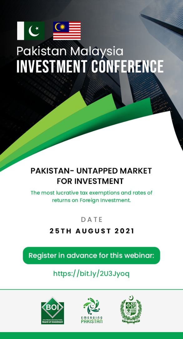The High Commission of Pakistan in Kuala Lumpur, Malaysia is organizing an online event, Pakistan Malaysia Investment Conference on 25th August 2021 at 3.00 pm.