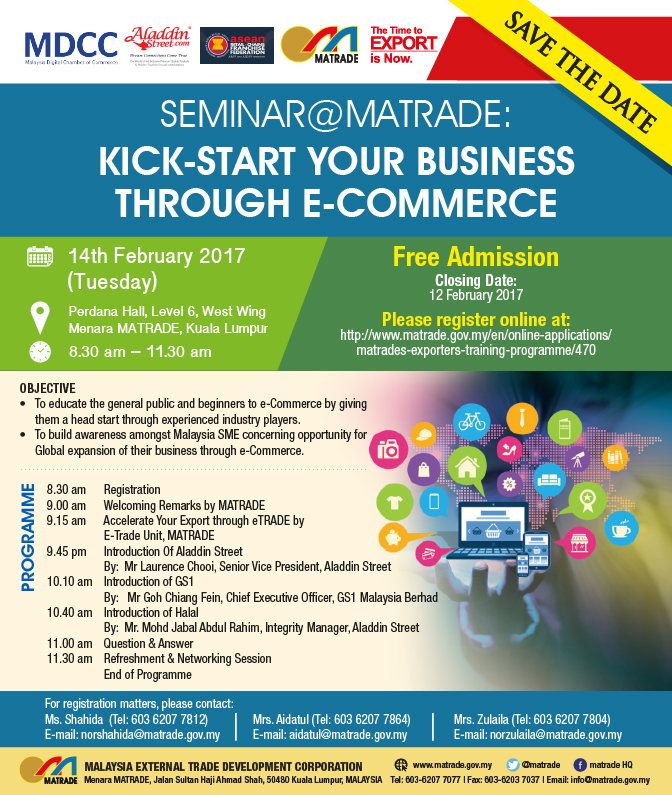 Malaysia External Trade Development Corporation (MATRADE) in collaboration with Aladdin Street, ASEAN Retail Chains And Franchise Federation (ARFF) and Malaysia Digital Chamber of Commerce (MDCC) will be organising a seminar on “Kick-Start Your Business Through E-Commerce” as follows: