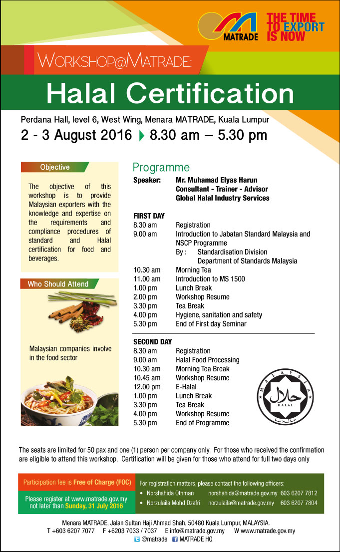 Malaysia External Trade Development Corporation (MATRADE) will be organising a workshop on “Halal Certification” as per the following date, time and venue: