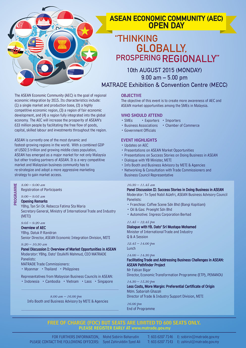 MATRADE cordially invite you to the ASEAN Economic Community (AEC) Open Day which will be held as follows:-
