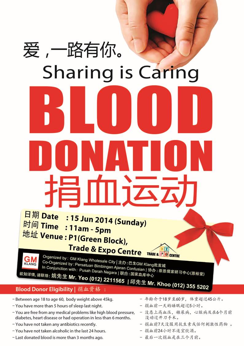 Blood donation campaign will be held on 15th June 2014 (11am ~ 5pm) in Hall A, Trade and Expo Centre, GM Klang Wholesale City.