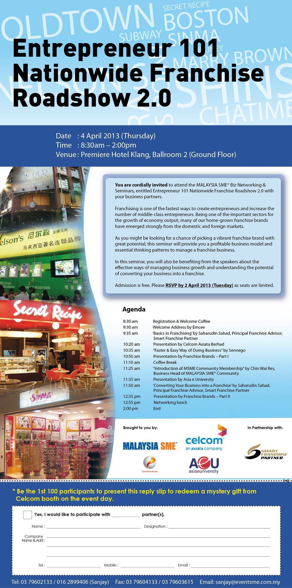 You are cordially invited to attend the MALAYSIA SME® Biz Networking & Seminar, entitled Entrepreneur 101 Nationwide Franchise Roadshow 2.0 with your business partners. The event will be held on 4 April (Thursday) at Premiere Hotel Klang.